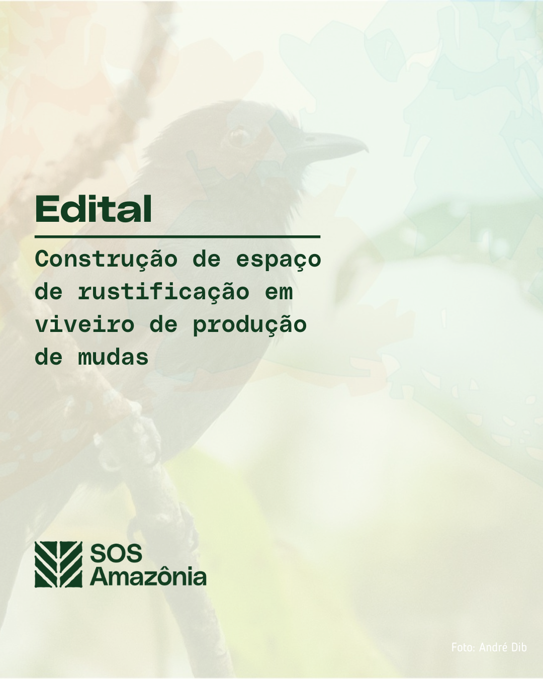A SOS Amazônia abre edital para contratação de empresa especializada na construção de espaço de rustificação para mudas produzidas no Viveiro SOS Amazônia, localizado em Capixaba (Acre). O espaço de rustificação deverá ter 43m de comprimento por 7m5 de largura, com espaço entre setores de 1m, sistema de irrigação contendo quatro eletroválvulas, 24 aspersores instalados em uma haste de tubo de 20mm x 1m2 sobre uma rede de tubos de 25mm, e uma linha de alimentação dos 4 setores com tubo de 32mm. O conjunto moto bomba será o mesmo utilizado no espaço de rustificação já instalado. Em todo o espaço receberá uma camada de 0,05m de brita 5/8. As demais especificações técnicas estão descritas no edital.