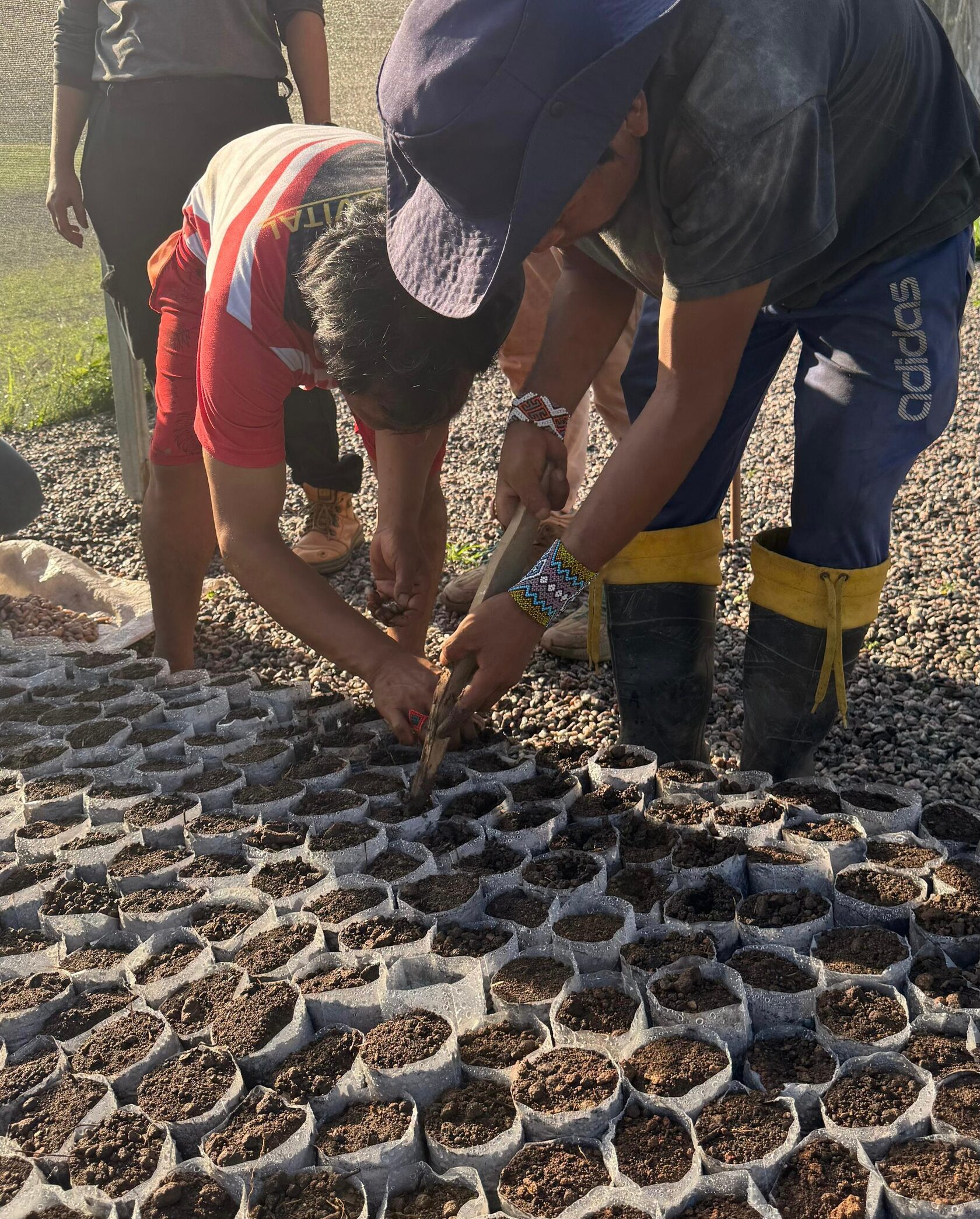 Sob o acompanhamento da equipe técnica da SOS Amazônia, os indígenas receberam orientações de boas práticas a serem adotadas no processo de produção de mudas, como o preparo do substrato para semeadura, o cuidado com pragas e ervas daninhas, a irrigação adequada e o enchimento de saquinhos.