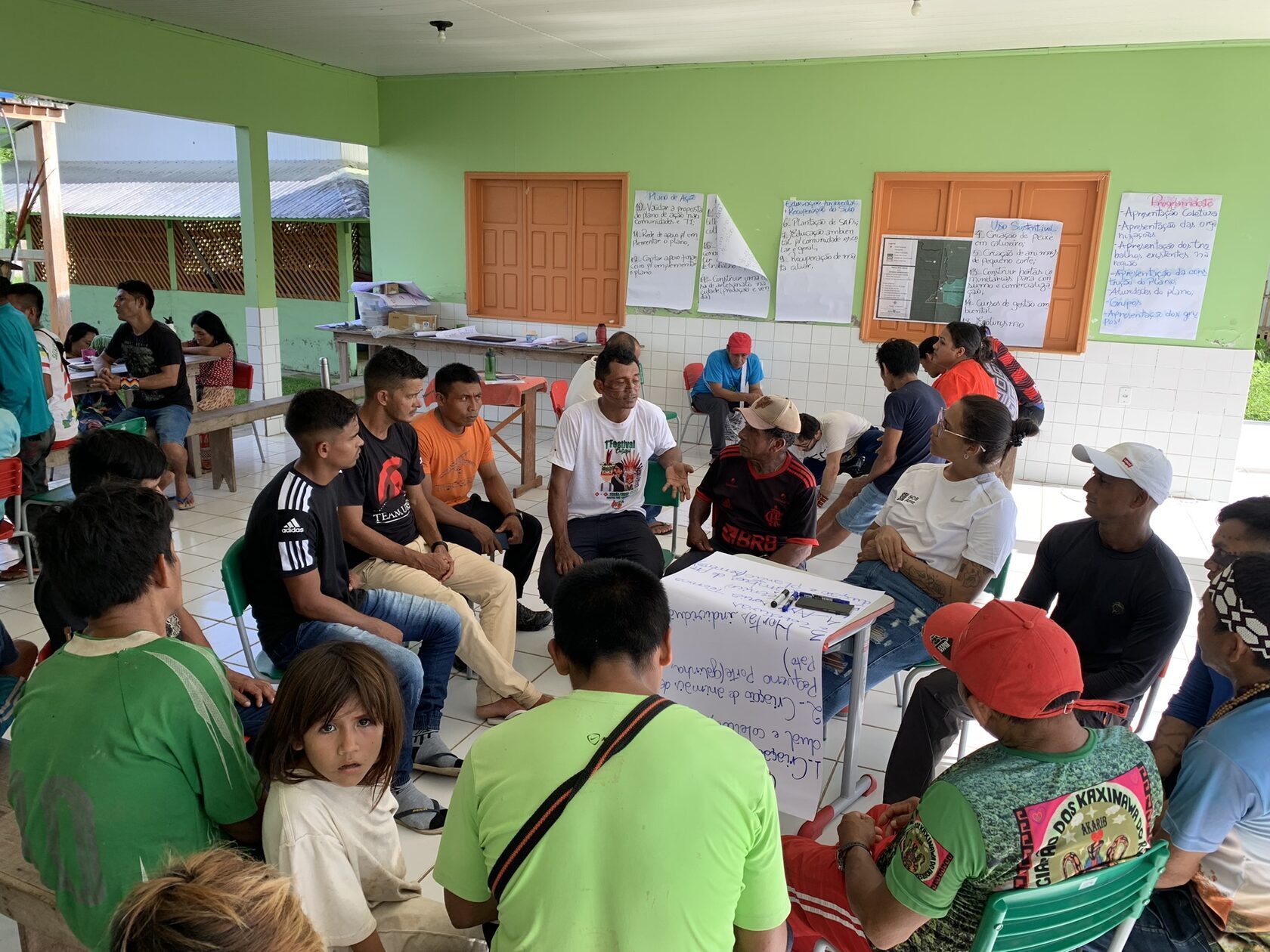 In November, three Integrated Management Workshops were held with the aim of advancing the Aliança Project and continuing its strategic plan. These workshops included the participation of community members and Indigenous peoples from the Extractivist Reserve Alto Tarauacá and Riozinho da Liberdade. During the meetings, each community's specific demands were discussed in order to propose partnerships and agreements among them. These partnerships help facilitate the development of monitoring, training, and formation strategies with the people living in the territory. Through integrated management activities, the leaders of peoples of the forest gain more resources to care for their communities and defend their land.