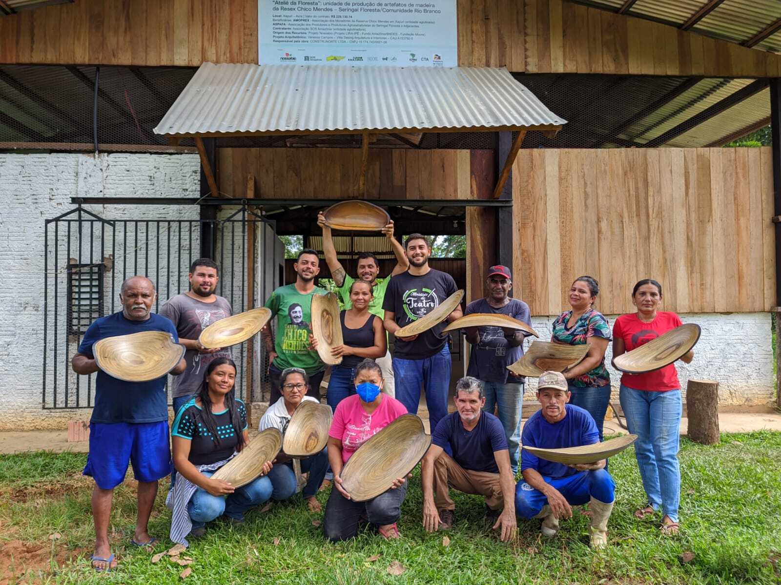 Offering an alternative source of income and employment, extractivists from the Chico Mendes Extractive Reserve are now becoming artisans—transforming fallen forest wood into furniture, household utensils, and art pieces. On June 9, 2024, the Forest Studio (Ateliê da Floresta) was officially opened, fulfilling the dream of Raimundo Mendes de Barros, an extractivist and environmental leader. The initiative is part of the Nossabio project (by Lira/IPÊ) in partnership with Amoprex (the Association of Inhabitants and Producers of the Chico Mendes Extractive Reserve in Xapuri). The opening ceremony was attended by the artisan group, local leaders, and representatives from partner organizations. Guests had the opportunity to view locally produced pieces, some of which are now destined for art galleries in Manaus and São Paulo, demonstrating the commercial potential of sustainable woodworking.